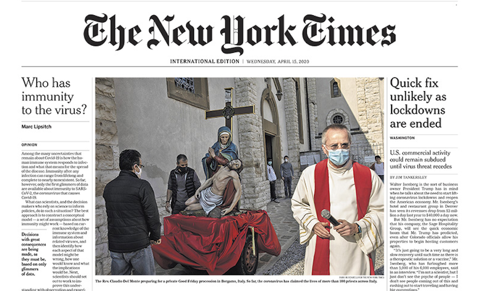 La prima pagina del New York Times del 15 aprile (New York Times)