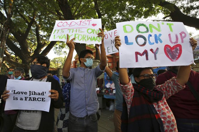 “Love Jihad” (“Jihad dell’amore”) è un’espressione islamofoba utilizzata dall’estremismo hindu per descrivere un presunto complotto portato avanti dalla minoranza musulmana del paese per sedurre, sposare e convertire le donne e raggiungere l’obiettivo della “sostituzione demografica”. A fine novembre in Uttar Pradesh è stata votata una legge che vieta la conversione ai fini del matrimonio, in base alla quale almeno dieci persone sono state arrestate e diversi matrimoni interreligiosi sono stati interrotti. Sulla base di questa teoria, promossa negli ultimi anni dagli esponenti del Bharatiya Janata Party (BJP, il partito al governo guidato dal primo ministro nazionalista hindu e conservatore Narendra Modi) altri quattro stati, tutti governati dal BJP, hanno proposto di limitare i matrimoni interreligiosi.