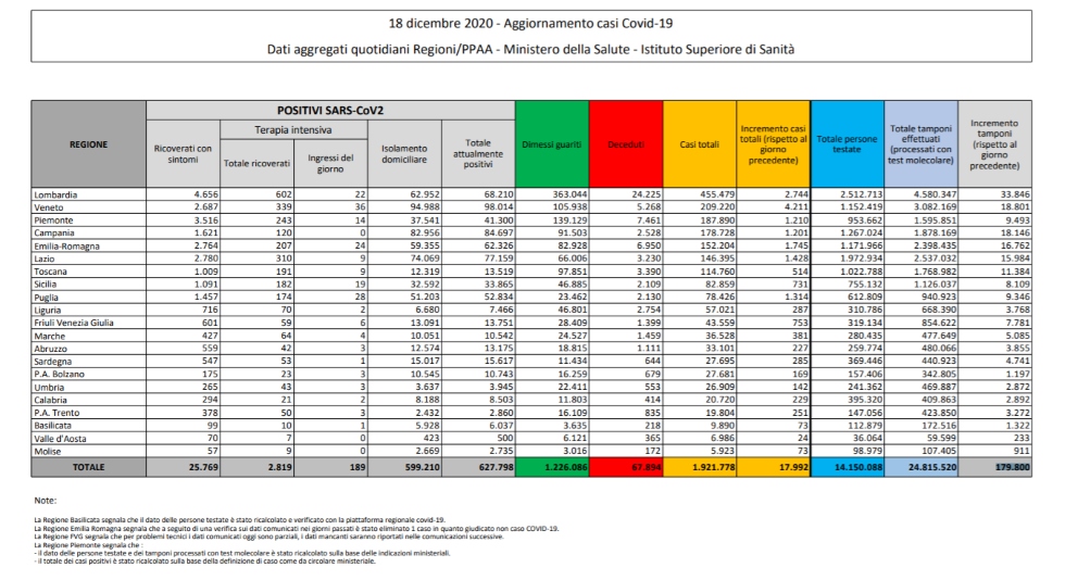 I dati sul coronavirus di oggi, venerdì 18 dicembre