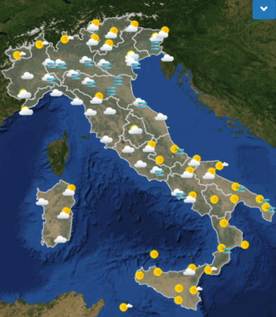 Secondo le previsioni meteo dell’Aeronautica Militare, mercoledì 23 dicembre sarà una giornata nuvolosa al Centro e al Nord, e soleggiata al Sud: di mattina ci sarà la consueta nebbia in pianura Padana, con nuvole in tutta la penisola tranne in Calabria, Basilicata e Sicilia. Di pomeriggio la situazione rimarrà invariata, mentre di sera è prevista pioggia dalle parti di Pisa. Infine di notte potrebbe piovere anche in Valle d’Aosta, in provincia di Sondrio e nella zona di La Spezia.