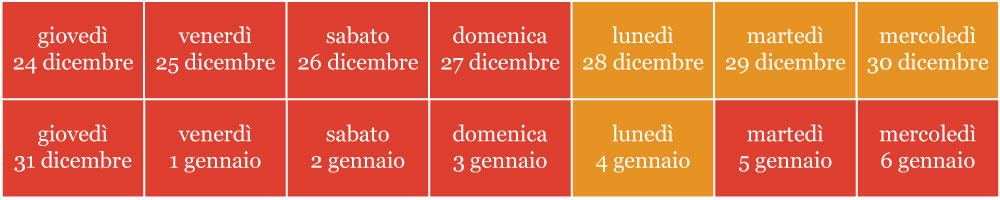 Da oggi 24 dicembre, vigilia di Natale, l’Italia è “zona rossa”: entra cioè in quei giorni con le misure più restrittive tra quelle decise dal governo con il decreto legge del 18 dicembre, che comunque permettono grazie ad alcune deroghe una certa libertà di movimento. Meno però dei giorni di “zona arancione” nazionale, che saranno i primi tre della prossima settimana, e poi il lunedì successivo. Le restrizioni e le regole per contenere i contagi da coronavirus nel periodo delle feste di Natale e Capodanno saranno valide dal 24 dicembre al 6 gennaio, e sono il risultato di una sovrapposizione di DPCM e decreti legge, cosa che ha provocato una certa diffusa confusione.