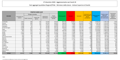 I dati sul coronavirus di oggi, domenica 27 dicembre