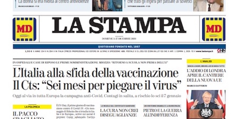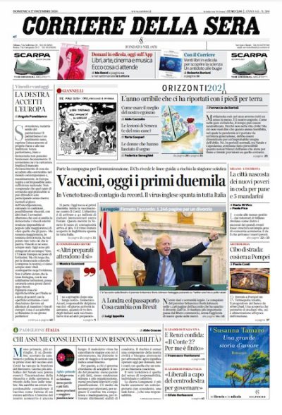 Quasi tutte le prime pagine dei giornali di oggi danno ampio spazio all’inizio della campagna vaccinale contro il coronavirus in Italia e in Europa: alcune sottolineano già nel titolo di apertura che questa non è la campagna vera e propria, ma una giornata di vaccinazioni “simbolica” . Alcuni giornali, anche i locali, parlano dei nuovi casi positivi alla cosiddetta “variante inglese” del coronavirus, rilevati a Napoli e in Veneto, mentre altri danno risalto alle immagini del termopolio (una sorta di antica tavola calda) scoperto a Pompei.