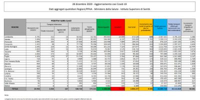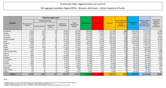 I dati sul coronavirus di oggi, lunedì 28 dicembre