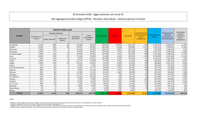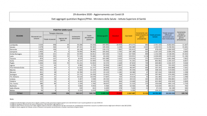 I dati sul coronavirus di oggi, martedì 29 dicembre