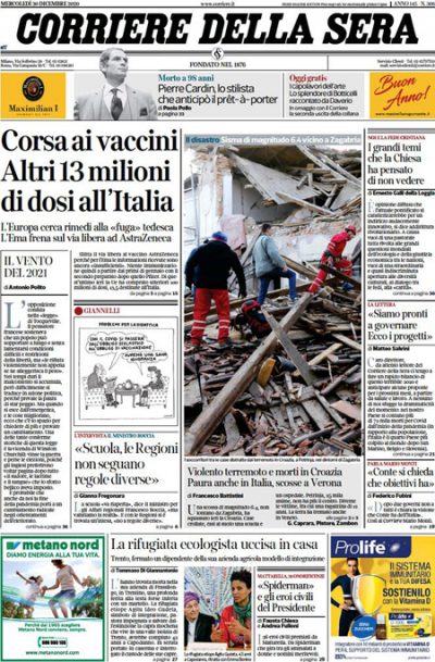 Le notizie sul vaccino, la morte di Pierre Cardin, e il terremoto in Croazia