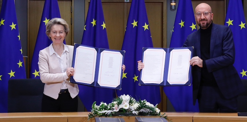 Ieri mattina l’accordo è stato firmato dalla presidente della Commissione Europea, Ursula von der Leyen, e dal presidente del Consiglio Europeo Charles Michel durante una breve cerimonia. L’Unione ha approvato l’accordo in via provvisoria: all’inizio di gennaio sarà ratificato sia dal Consiglio dell’Unione Europea – l’organo formato dai rappresentanti di governo dei 27 paesi membri – sia dal Parlamento Europeo, che dovrà approvarlo durante una sessione plenaria.