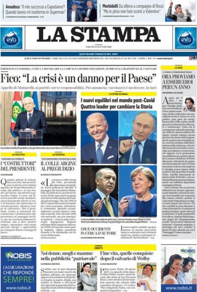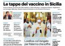 Le notizie principali in apertura sui giornali di oggi sono due: l’andamento della campagna di vaccinazione contro il coronavirus in Italia, e il discorso di fine anno del presidente della Repubblica Mattarella. Il Messaggero si occupa invece della riapertura delle scuole dal 7 gennaio, la Stampa intervista il presidente della Camera Fico, il Giornale si preoccupa per la scadenza delle cartelle esattoriali che erano state rinviate nel 2020 per l’epidemia, e la Gazzetta dello Sport intervista Papa Francesco.