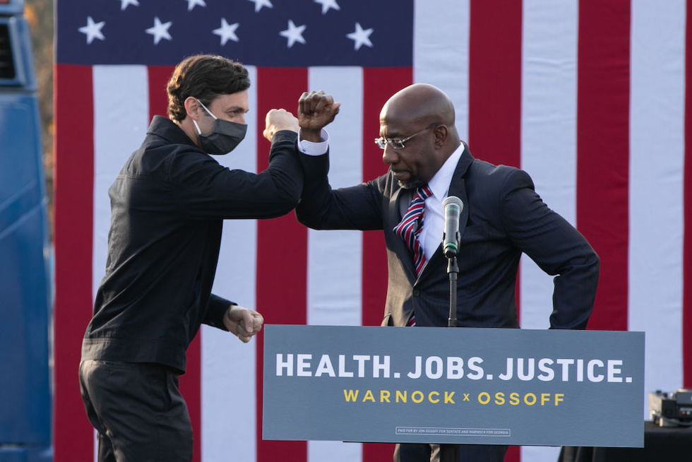 Ossoff a sinistra e Warnock a destra, fotografati durante un recente evento elettorale a Stonecrest, Georgia (Jessica McGowan/Getty Images)