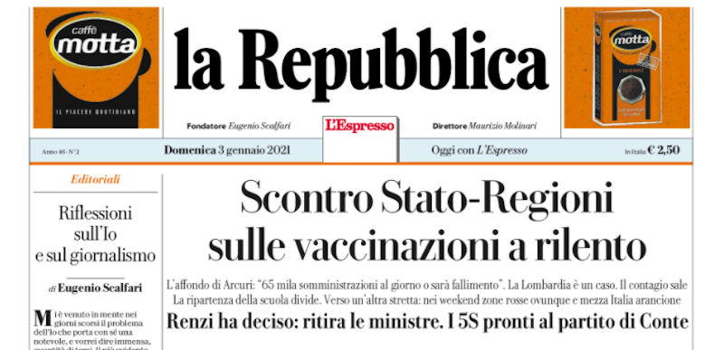 Sui giornali di oggi si parla molto di vaccinazioni e di come in Italia per ora se ne siano ancora fatte poche (specialmente in alcune regioni, come la Lombardia). Ma si parla anche del fatto che i contagi hanno ricominciato a crescere da alcuni giorni, così come i ricoveri: e questo potrebbe portare a nuove restrizioni o a un rinvio della riapertura delle scuole superiori prevista per il 7 gennaio. E infine si parla di una prossima crisi di governo: diversi giornali danno per certa la decisione di Matteo Renzi di ritirare i ministri di Italia viva dal governo Conte, che a quel punto dovrebbe capire cosa fare.