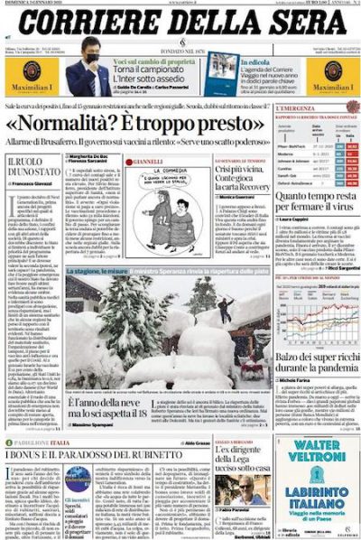 Sui giornali di oggi si parla molto di vaccinazioni e di come in Italia per ora se ne siano ancora fatte poche (specialmente in alcune regioni, come la Lombardia). Ma si parla anche del fatto che i contagi hanno ricominciato a crescere da alcuni giorni, così come i ricoveri: e questo potrebbe portare a nuove restrizioni o a un rinvio della riapertura delle scuole superiori prevista per il 7 gennaio. E infine si parla di una prossima crisi di governo: diversi giornali danno per certa la decisione di Matteo Renzi di ritirare i ministri di Italia viva dal governo Conte, che a quel punto dovrebbe capire cosa fare.