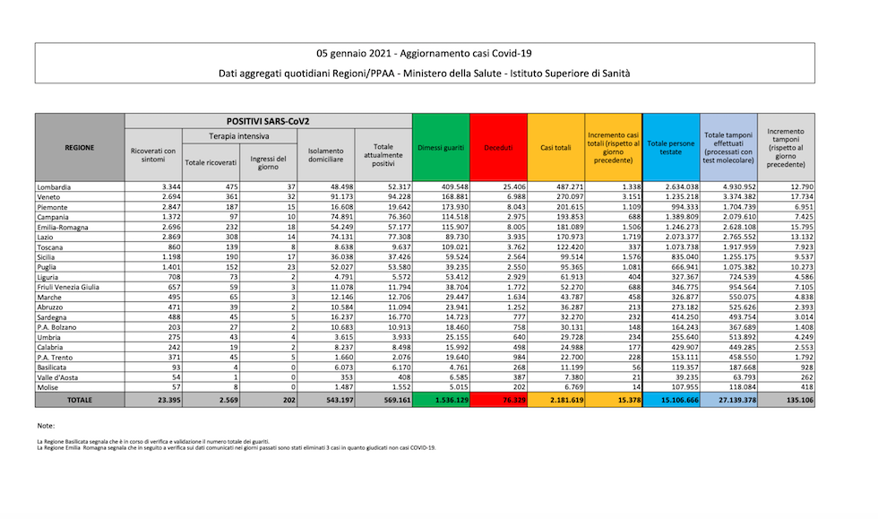 I dati sul coronavirus in Italia di oggi, martedì 5 gennaio
