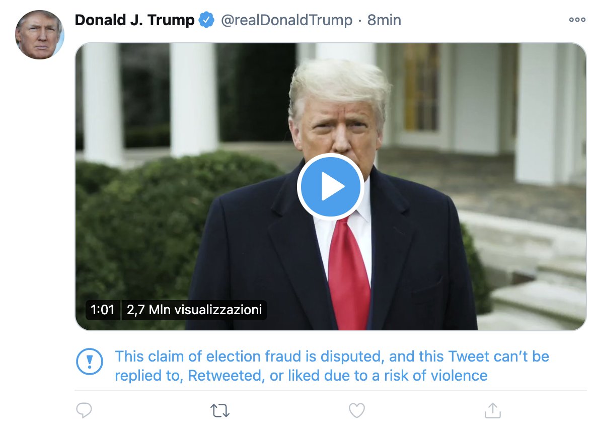 La regola è stata applicata anche a un tweet pubblicato dall’account di Trump alle 22:37 (ora italiana), nel quale il presidente uscente invitava i propri sostenitori a lasciare il palazzo del Congresso, mostrandosi comunque molto comprensivo nei loro confronti – «Siete speciali, vi vogliamo bene» – e ribadendo che l’elezione gli fosse stata «sottratta». Novanta minuti dopo, Trump ha pubblicato un secondo tweet riferendosi ai violenti come “grandi patrioti” che avevano subìto il furto dell’elezione.
