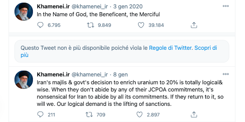 Twitter ha rimosso un tweet in cui l’ayatollah iraniano Ali Khamenei contestava l’affidabilità dei vaccini occidentali contro il coronavirus