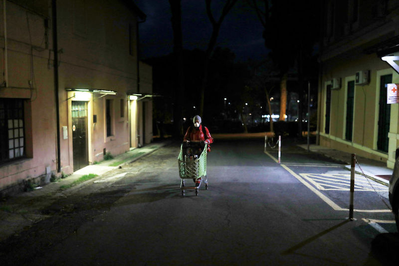 Un volontario della Croce Rossa prima di iniziare la distribuzione di 50 pasti per i senzatetto, Roma, 17 marzo 2020