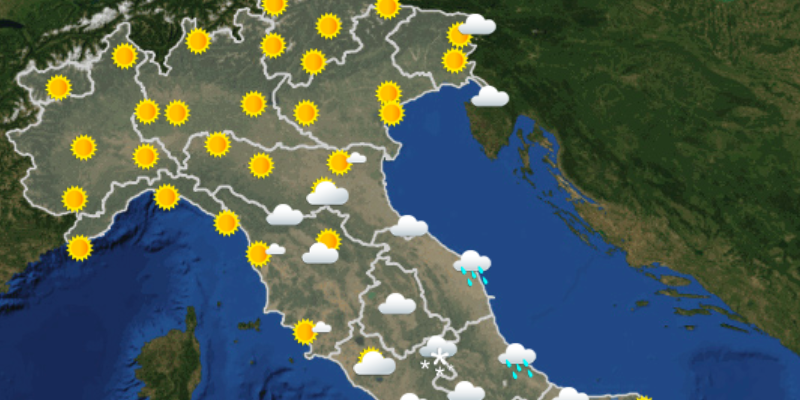 Secondo il servizio meteorologico dell’Aeronautica Militare, la giornata di domani, lunedì 11 gennaio 2021, sarà prevalentemente soleggiata al Nord e coperta al Centro, Sud e isole, con piogge lungo la costa adriatica tra Marche e Abruzzo e nevicate sugli Appennini umbri e laziali. In Sardegna sono previsti temporali e piogge per tutta la giornata. Nella notte il tempo sarà stabile in tutto il paese. Le temperature massime e minime saranno stazionarie sulle regioni adriatiche centrali, in calo altrove.