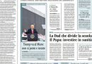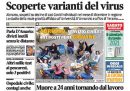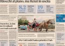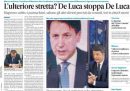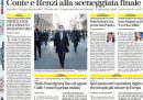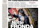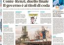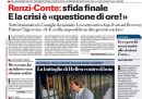 Tutti i giornali di oggi si occupano in apertura dell’attesa per la possibile crisi di governo, che potrebbe arrivare oggi se Italia Viva annunciasse le dimissioni delle sue due ministre dopo la discussione nel Consiglio dei ministri di ieri sera del piano del governo sul Recovery Fund. Nei titoli si sottolineano la volontà del presidente del Consiglio Conte di escludere Italia Viva da un nuovo governo, le preoccupazioni del presidente della Repubblica Mattarella, e la ricerca di senatori disposti a votare la fiducia per sostenere il governo.