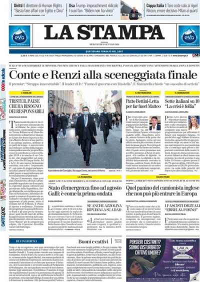 Tutti i giornali di oggi si occupano in apertura dell’attesa per la possibile crisi di governo, che potrebbe arrivare oggi se Italia Viva annunciasse le dimissioni delle sue due ministre dopo la discussione nel Consiglio dei ministri di ieri sera del piano del governo sul Recovery Fund. Nei titoli si sottolineano la volontà del presidente del Consiglio Conte di escludere Italia Viva da un nuovo governo, le preoccupazioni del presidente della Repubblica Mattarella, e la ricerca di senatori disposti a votare la fiducia per sostenere il governo.