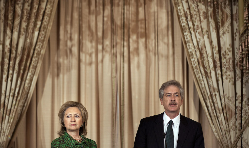 La segretaria di Stato Hillary Clinton e il vicesegretario agli Esteri William Burns il 16 febbraio 2011 (Brendan Smialowski/Getty Images)