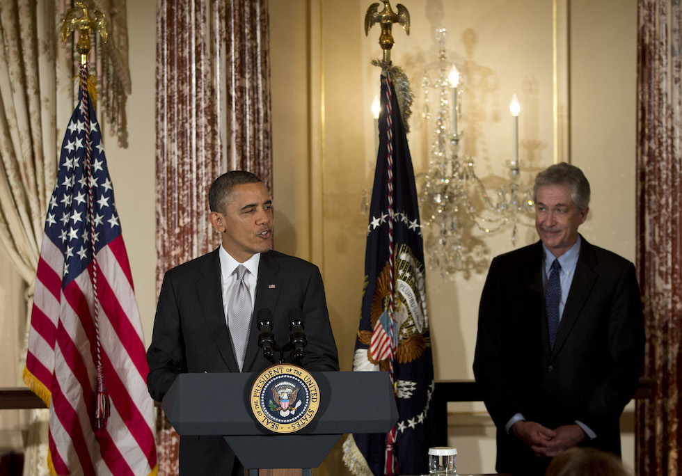 Il presidente Barack Obama e il vicesegretario di Stato William Burns al dipartimento di Stato, Washington, 19 dicembre 2012 (AP Photo/Carolyn Kaster)