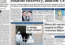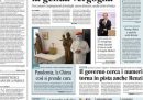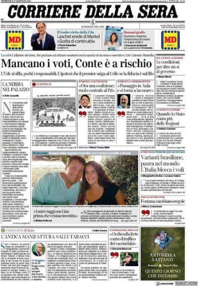 La maggior parte delle prime pagine dei quotidiani dice che i tentativi del presidente del Consiglio Giuseppe Conte di trovare abbastanza senatori disposti a sostenere il governo al voto di martedì non stanno andando molto bene. Il governo insomma rischia di cadere, secondo i cronisti politici. Sui giornali di oggi si parla anche degli anziani morti in una RSA vicino a Roma per una probabile intossicazione da monossido di carbonio, e dei ritardi nelle consegne del vaccino di Pfizer. I quotidiani sportivi aprono tutti su Inter-Juventus, stasera.