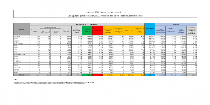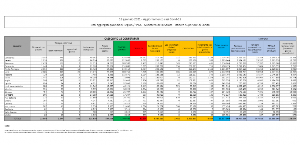 I dati sul coronavirus in Italia di oggi, lunedì 18 gennaio