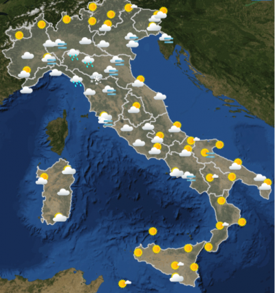 Secondo il servizio meteorologico dell’Aeronautica Militare, la giornata di mercoledì sarà serena e parzialmente nuvolosa al Centro-Sud, mentre peggiorerà nel corso della giornata al Nord con piogge sparse e isolate: di mattina pioverà soltanto in Emilia e nella Toscana settentrionale, e ci sarà neve sull’appennino tosco-emiliano, mentre di pomeriggio il brutto tempo si estenderà a tutto il Nord, con l’eccezione dell’arco alpino, con piogge nella Lombardia orientale.