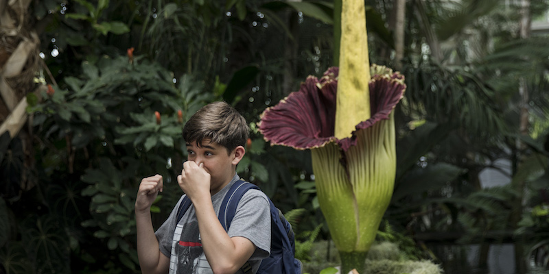 Certe piante, quando fioriscono, attirano un gran numero di umani. Lo fanno, notoriamente, i numerosi ciliegi di Tokyo, che con i loro fiorellini rosa offrono uno sfondo perfetto per una foto ricordo. Ma lo fa anche una pianta del tutto diversa, e ben più rara: l’aro titano. La sua infiorescenza è nota per tre cose: può superare i 3 metri d’altezza, ha una forma fallica (da cui il nome scientifico della specie, Amorphophallus titanum) e puzza di cadavere. Per tutte queste caratteristiche, gli orti botanici pubblicizzano molto la fioritura dei loro ari titani, anche perché capita molto di rado. Così di rado, peraltro, che la stessa esistenza della specie è a rischio. Ma l’Orto botanico di Chicago, ha raccontato l’Atlantic, ha un piano per salvarla.