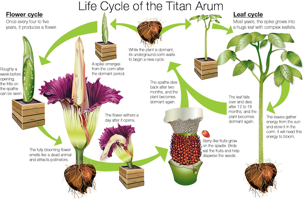 In giro per internet potreste leggere che è la pianta con il più grande fiore del mondo. Tecnicamente non è così, perché quello che ci verrebbe da chiamare “fiore” è in realtà un’infiorescenza, cioè una struttura su cui fioriscono numerosi piccoli fiori. La parte di forma fallica, quella che può raggiungere i tre metri d’altezza, in gergo tecnico si chiama spadice: ce l’hanno anche le calle. L’aro titano fiorisce di rado perché per produrre un’infiorescenza tanto grande serve molta energia: viene accumulata in cicli di vita successivi in cui la pianta si limita a produrre una singola grande foglia che faccia la fotosintesi. Non è possibile prevedere dopo quanti cicli-foglia un aro titano fiorirà: in genere non succede prima dei dieci anni di vita della pianta, e poi possono passare dai due ai dieci anni tra una volta e l’altra.