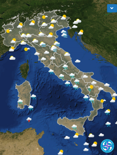 Domenica le regioni del Nord inizieranno la giornata con un cielo nuvoloso, che si andrà schiarendo in tarda mattinata e nel pomeriggio; in serata tornerà nuvoloso e pioverà su Valle d’Aosta e sulle Alpi piemontesi. Al Centro e al Sud ci saranno piogge e temporali soprattutto di mattina, poi di pomeriggio arriverà il sole in Sardegna, Toscana e Lazio settentrionale. Pioverà sulle regioni tirreniche meridionali, in particolare in Campania, Basilicata e Calabria; la situazione migliorerà in serata tranne che in Campania meridionale e in Calabria.