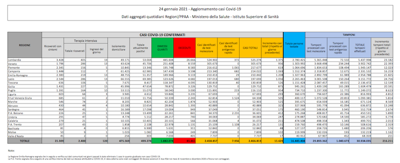 I dati sul coronavirus in Italia di domenica 24 gennaio