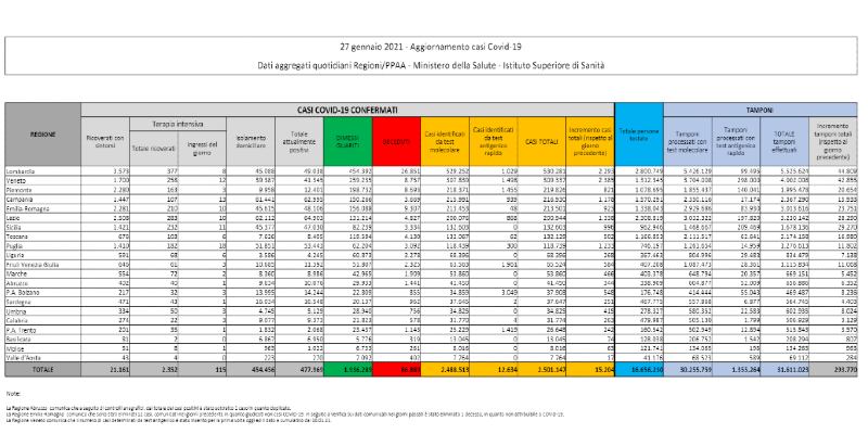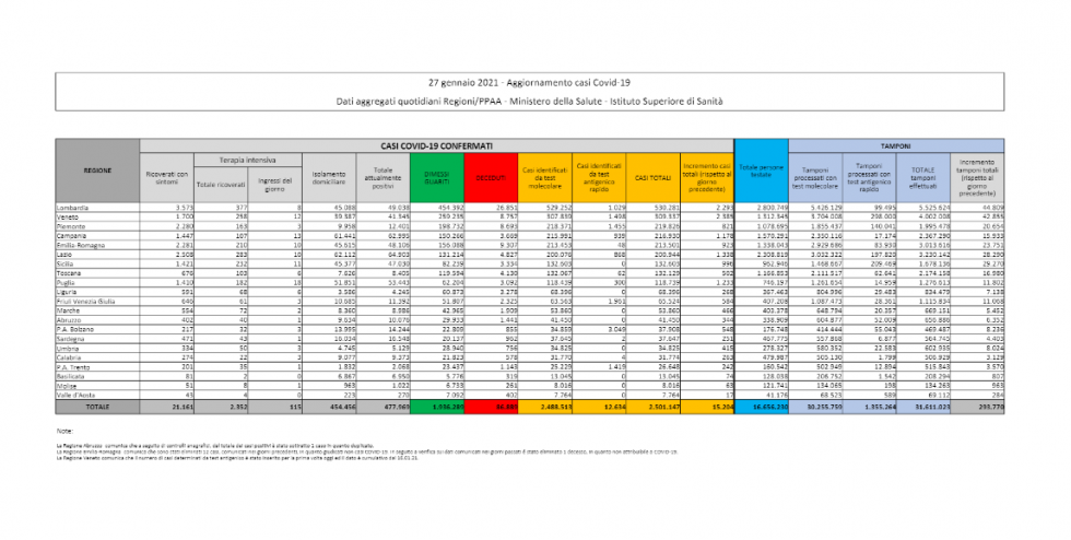 I dati sul coronavirus in Italia di oggi, mercoledì 27 gennaio