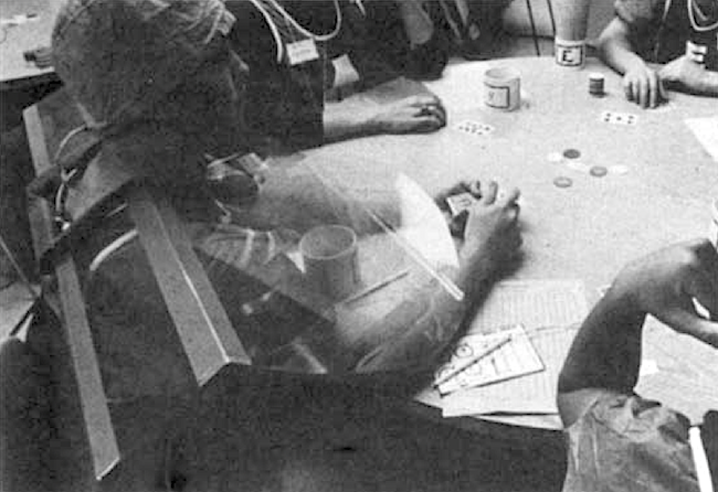 Un partecipante all’esperimento gioca a carte indossando un dispositivo che gli impedisce di toccarsi la faccia (Elliot C. Dick et al., The Journal of Infectious Diseases, 1987)