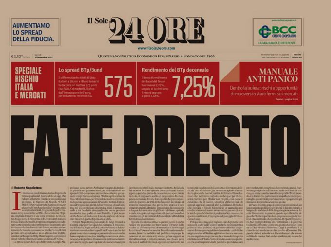 Nel frattempo, e nel giro di pochi mesi, lo spread aveva raggiunto livelli record, e quando toccò quota 574 punti, il 10 novembre del 2011 il Sole 24 Ore mise in prima pagina un titolo enorme: “Fate presto”, una citazione di un famoso titolo sul terremoto in Irpinia del 1980. Il giorno prima, il 9 novembre, l’allora presidente della Repubblica Giorgio Napolitano aveva nominato Mario Monti, ex commissario europeo, senatore a vita. Poco dopo, come senatore a vita, Monti si presentò al Senato dove era in discussione la legge di stabilità, ultimo atto del quarto (e ultimo) governo Berlusconi.