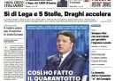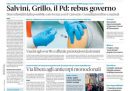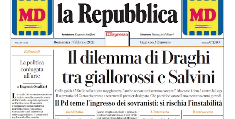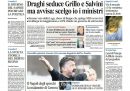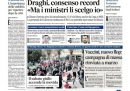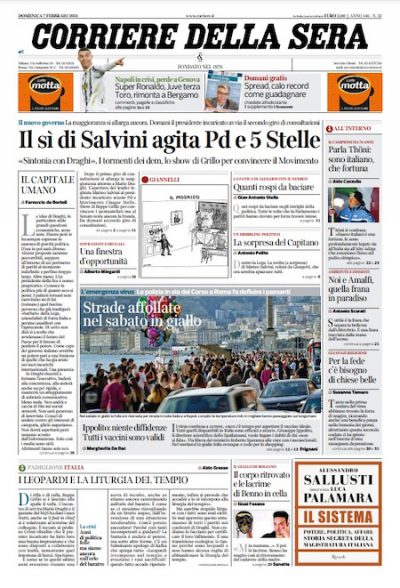 In mancanza di altre grosse notizie, gran parte dei giornali di oggi apre con le trattative per formare un nuovo governo portate avanti dal presidente incaricato Mario Draghi: sabato si sono concluse le consultazioni e le prime pagine danno ampio spazio ai toni di apertura usati dal leader della Lega Matteo Salvini, cosa che sta complicando la posizione del Movimento 5 Stelle che invece si è esposto meno e ha usato toni interlocutori. Gli sportivi si dedicano invece alla vittoria della Juventus sulla Roma, di cui è stato protagonista Cristiano Ronaldo.