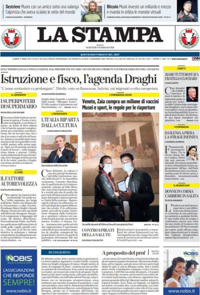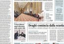 I giornali di oggi titolano tutti sul tentativo di formare un nuovo governo da parte del presidente del Consiglio incaricato Mario Draghi, con il secondo giro di consultazioni con i partiti che si concluderà oggi e le prime ipotesi sul possibile prolungamento dell’anno scolastico fino a fine giugno, l’accelerazione della campagna di vaccinazione per il coronavirus, e le riforme di pubblica amministrazione e giustizia. Il Manifesto apre sulla decisione del Movimento 5 Stelle di far votare gli iscritti su Rousseau per decidere sul sostegno al governo Draghi, mentre i giornali sportivi presentano il ritorno della semifinale di Coppa Italia di stasera fra Juventus e Inter che deciderà la prima finalista.