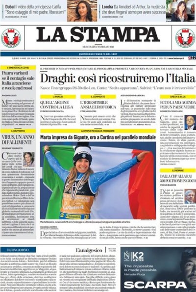 Ci sono notizie diverse in apertura sui giornali di oggi: alcuni titolano sull’intervento di oggi del presidente del Consiglio Draghi al Senato nel dibattito sulla fiducia al nuovo governo, altri aprono sui dati sulla diffusione del coronavirus e sull’andamento della campagna di vaccinazione, altri ancora si occupano della sentenza del TAR del Lazio che ha annullato la nomina di Michele Prestipino a capo della Procura di Roma. Il Messaggero titola sull’ipotesi di prolungamento fino a giugno del blocco dei licenziamenti, mentre i giornali sportivi presentano la partita di stasera fra Juventus e Porto per gli ottavi di finale della Champions League.