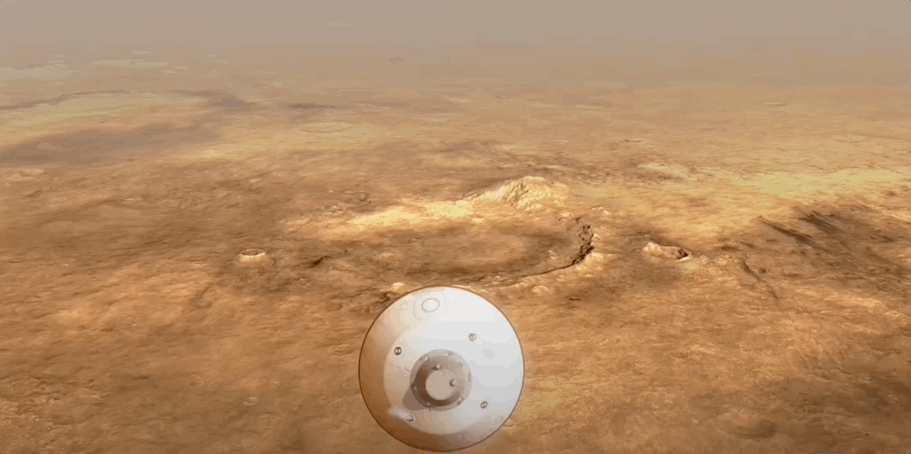 Una volta aperto il paracadute, lo scudo termico si è sganciato e la parte inferiore del rover è stata esposta per la prima volta all’ambiente marziano. A poco più di un minuto dall’atterraggio, anche la parte superiore dell’involucro si è separata dal resto di Perseverance ed è iniziata la parte più acrobatica della missione.