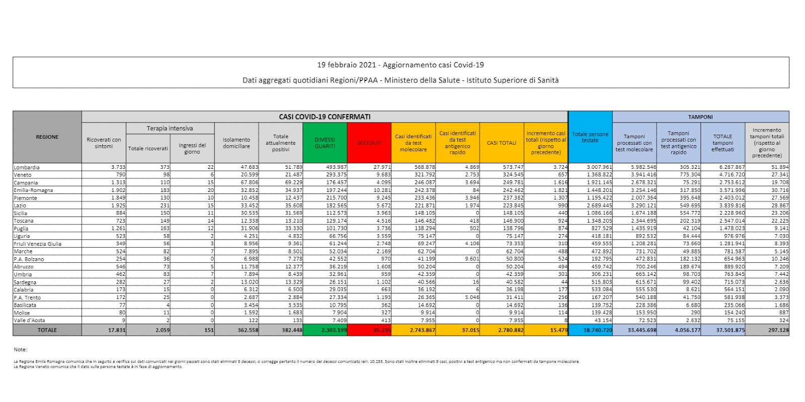 I dati sul coronavirus in Italia di oggi, venerdì 19 febbraio