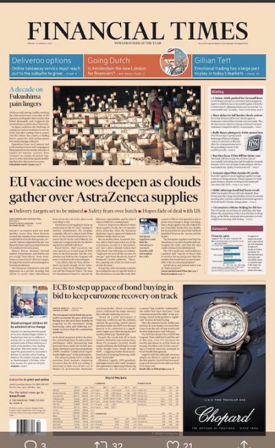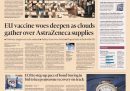 Nonostante venerdì mattina diversi quotidiani italiani abbiano scelto di aprire con la sospensione precauzionale di un lotto dei vaccini contro il coronavirus prodotti da AstraZeneca, i principali quotidiani europei si sono comportati in maniera diversa. Nessuno di loro ha dedicato alla notizia il titolo principale.
