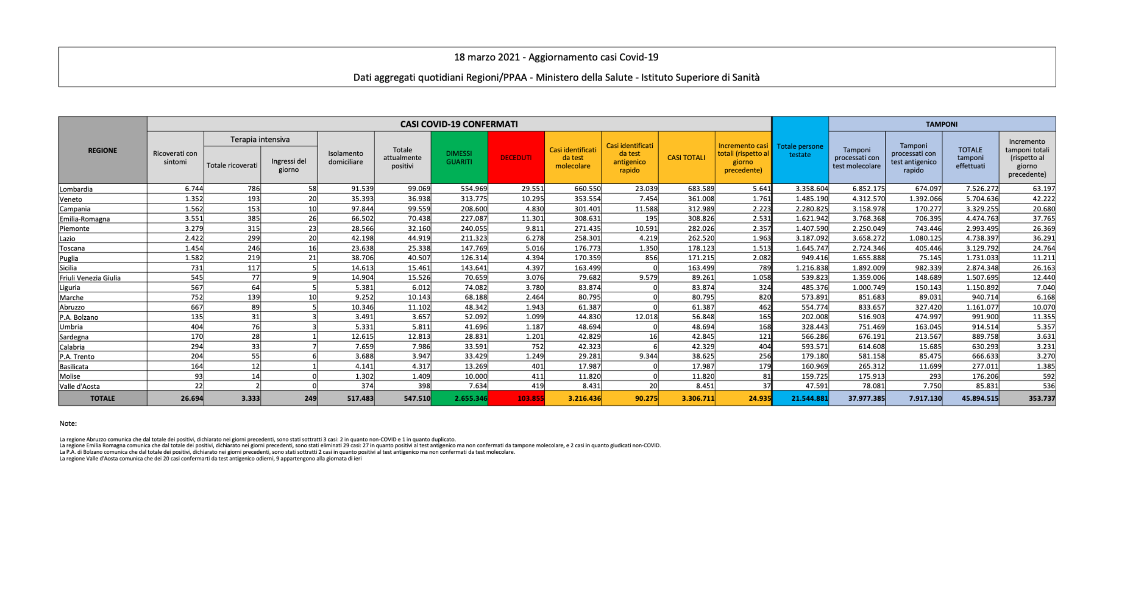 Le regioni che hanno registrato più casi nelle ultime 24 ore sono Lombardia (5.641), Emilia-Romagna (2.531), Piemonte (2.357), Campania (2.223), Puglia (2.082).