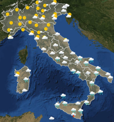 Secondo il servizio meteorologico dell’Aeronautica militare, sabato 20 marzo in Italia sarà una giornata prevalentemente serena al Nord e nuvolosa con piogge al Centro Sud. Al mattino pioverà quasi ovunque nelle regioni centrali e in quelle meridionali, con nevicate in Molise e Basilicata e temporali in Sicilia. Nel pomeriggio smetterà di piovere nel Lazio, Campania e Sicilia e in serata anche in Calabria. Nella notte tornerà a piovere in tutte le regioni del Centro Sud, con l’esclusione della Sardegna.