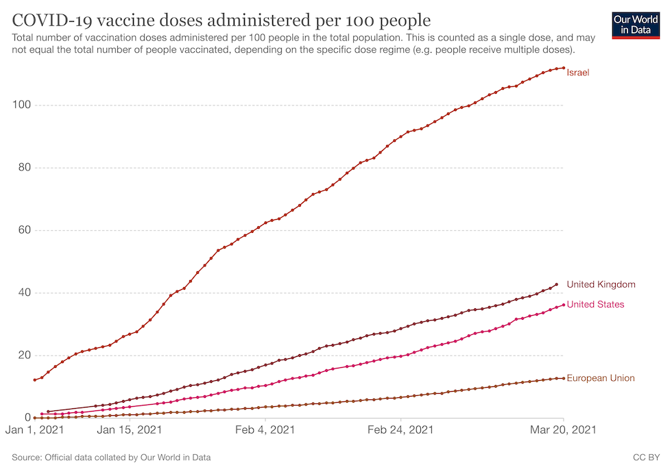 (il numero di dosi somministrate in Israele, negli Stati Uniti, nel Regno Unito e nell’Unione Europea ogni 100 abitati, in un grafico di Our World In Data)