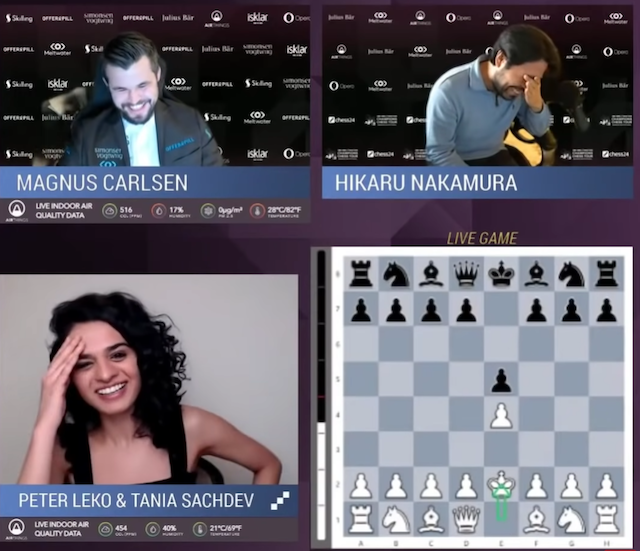 Durante una partita di un prestigioso torneo di scacchi online, il campione del mondo in carica dal 2013 Magnus Carlsen e lo stimato sfidante Hikaru Nakamura hanno provocato una certa ilarità ed eccitazione tra gli appassionati decidendo scherzosamente di cominciare la partita con quella che è considerata l’apertura più stupida e insensata del gioco, nota come “Bongcloud” e diventata per l’occasione Double Bongcloud (perché fatta da entrambi i giocatori). «Anche le peggiori aperture tendono ad avere, talvolta, qualcosa che le salva. L’apertura Bongcloud invece no» ha scritto il Guardian per descrivere la mossa, che blocca pezzi determinanti e va contro alcuni basilari principi del gioco. Non si era mai vista in una partita di così alto profilo, come hanno suggerito le reazioni degli stessi Carlsen e Nakamura e della commentatrice della partita, la scacchista Tania Sachdev.