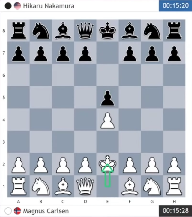 Nakamura, a quel punto, ha scelto di rispondere per le rime e di mettersi nella stessa condizione di Carlsen, facendo a sua volta un’apertura Bongcloud.