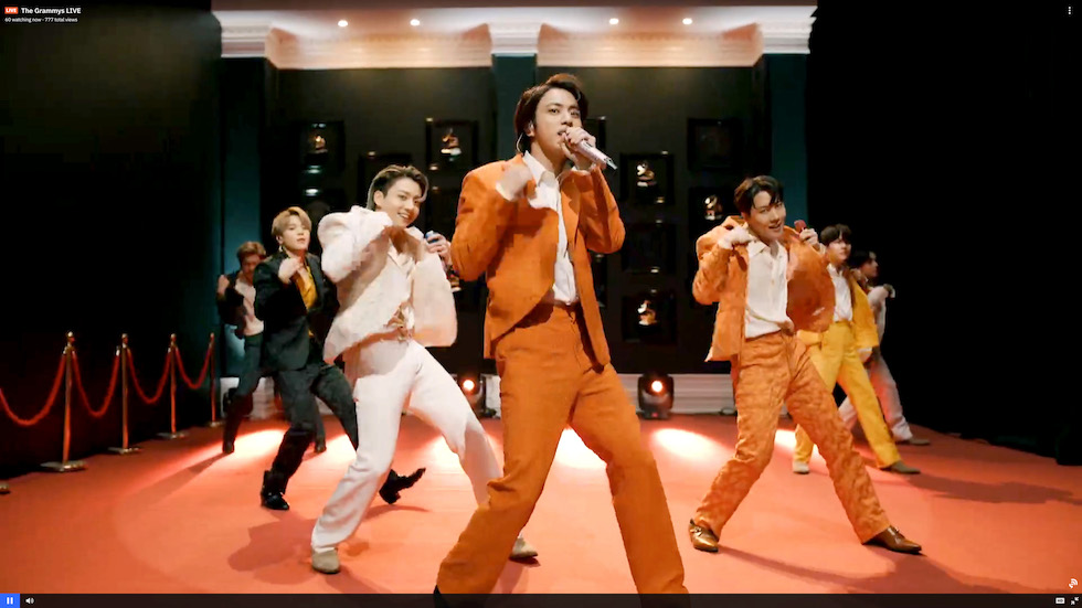 Un’immagine della performance dei BTS durante la cerimonia dei Grammy 2021 (Theo Wargo/Getty Images for The Recording Academy)