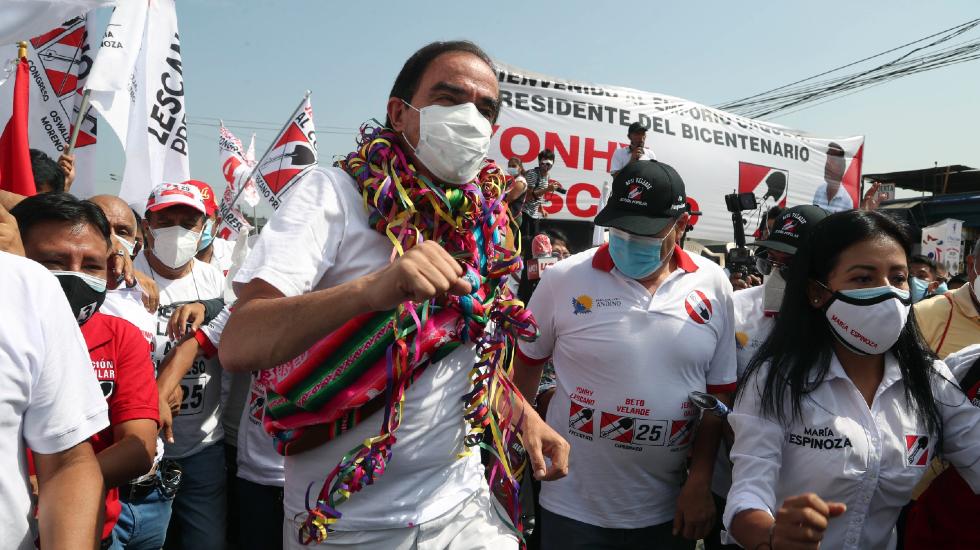 Yonhy Lescano con alcuni sostenitori a Lima, 5 aprile 2021 (AP Photo/ Martin Mejia)