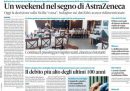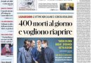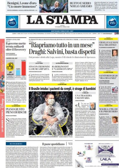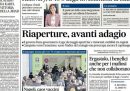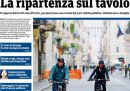La proposta delle regioni con le linee guida richieste per le riaperture e le ipotesi sui tempi e le modalità che dovranno essere decisi dal governo sono in apertura sulla maggior parte dei giornali di oggi. Qualche giornale segue invece l’andamento della campagna di vaccinazione contro il coronavirus, il Sole 24 Ore, il Manifesto e Libero aprono sull’approvazione del Documento di Economia e Finanza da parte del Consiglio dei ministri, Avvenire, il Riformista e il Dubbio titolano sulla decisione della Corte Costituzionale che ha dichiarato incostituzionale l’ergastolo ostativo, concedendo al Parlamento un anno per provvedere con una nuova legge, e i giornali sportivi commentano la qualificazione della Roma alle semifinali di Europa League, grazie al pareggio di ieri sera con l’Ajax.