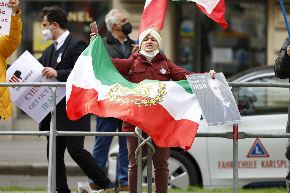 Manifestanti di un gruppo antigovernativo iraniano vicino all’hotel di Vienna dove si stanno tenendo i colloqui sul nucleare (AP Photo/Lisa Leutner)