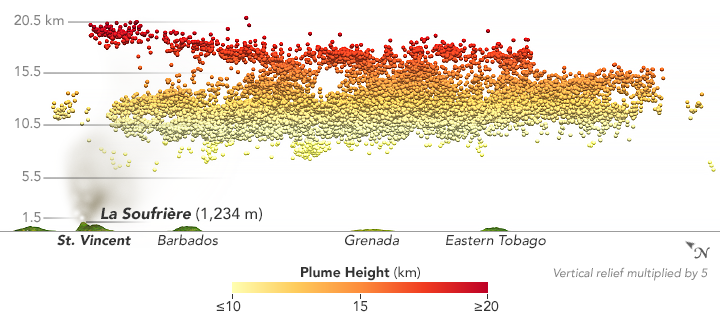 Le altezze raggiunte dalla nube di cenere e gas prodotta da La Soufrière in un’immagine della NASA pubblicata il 10 aprile; alla latitudine di Saint Vincent la stratosfera inizia a circa 18mila metri di altezza (NASA)